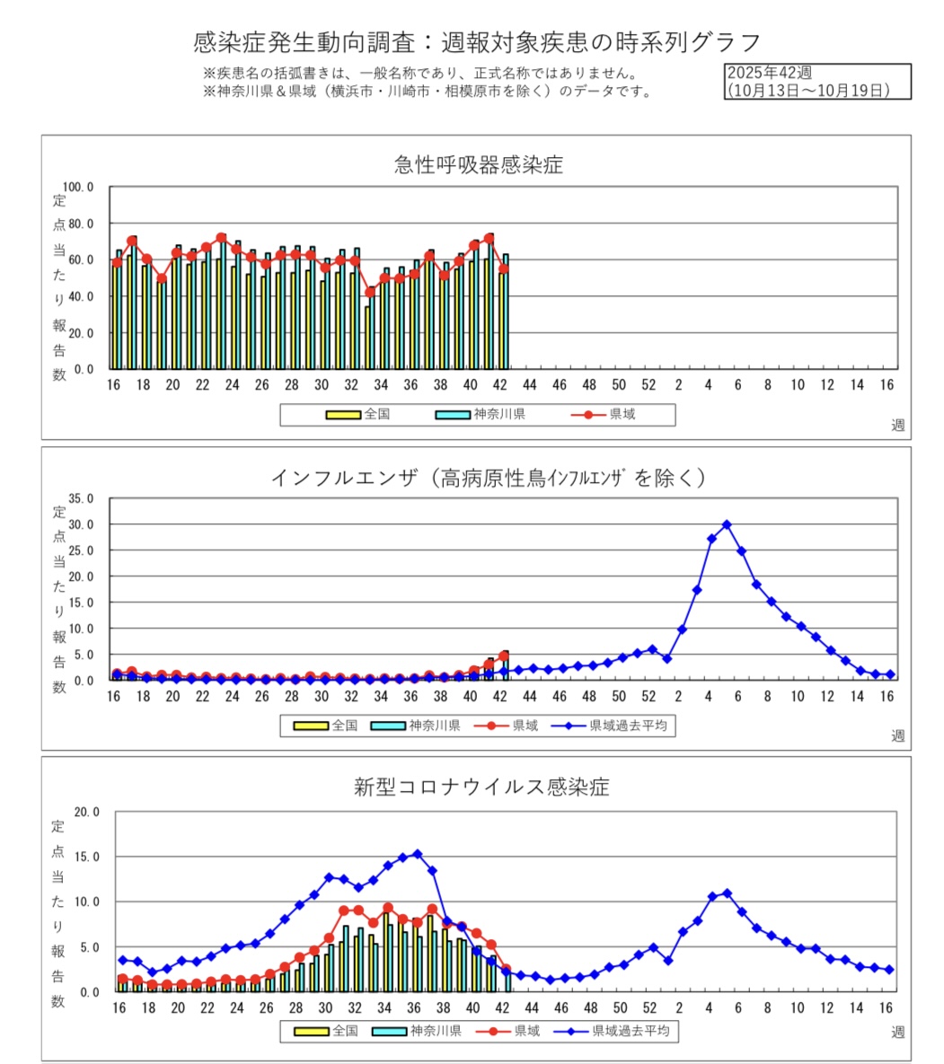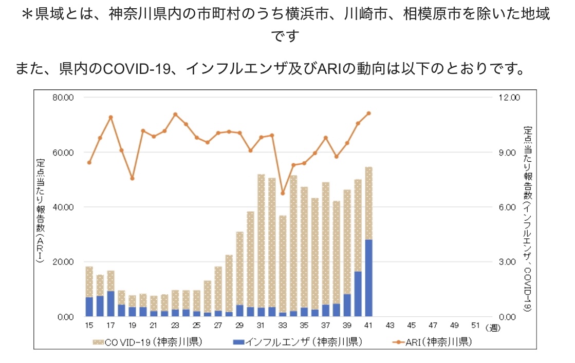 コロナは減りました。インフルエンザは増加。特に川崎、平塚、厚木で流行しています。