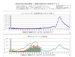 R7年10月5日時点でのインフルエンザ、コロナウイルス感染症患者数の報告です