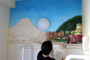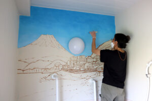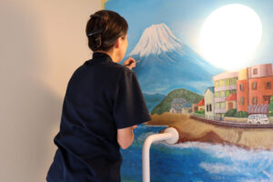 このたび15周年を記念し、やと自慢の浴室に、昨年より入職いたしました介護スタッフ村上が銭湯画を描かせていただきました。